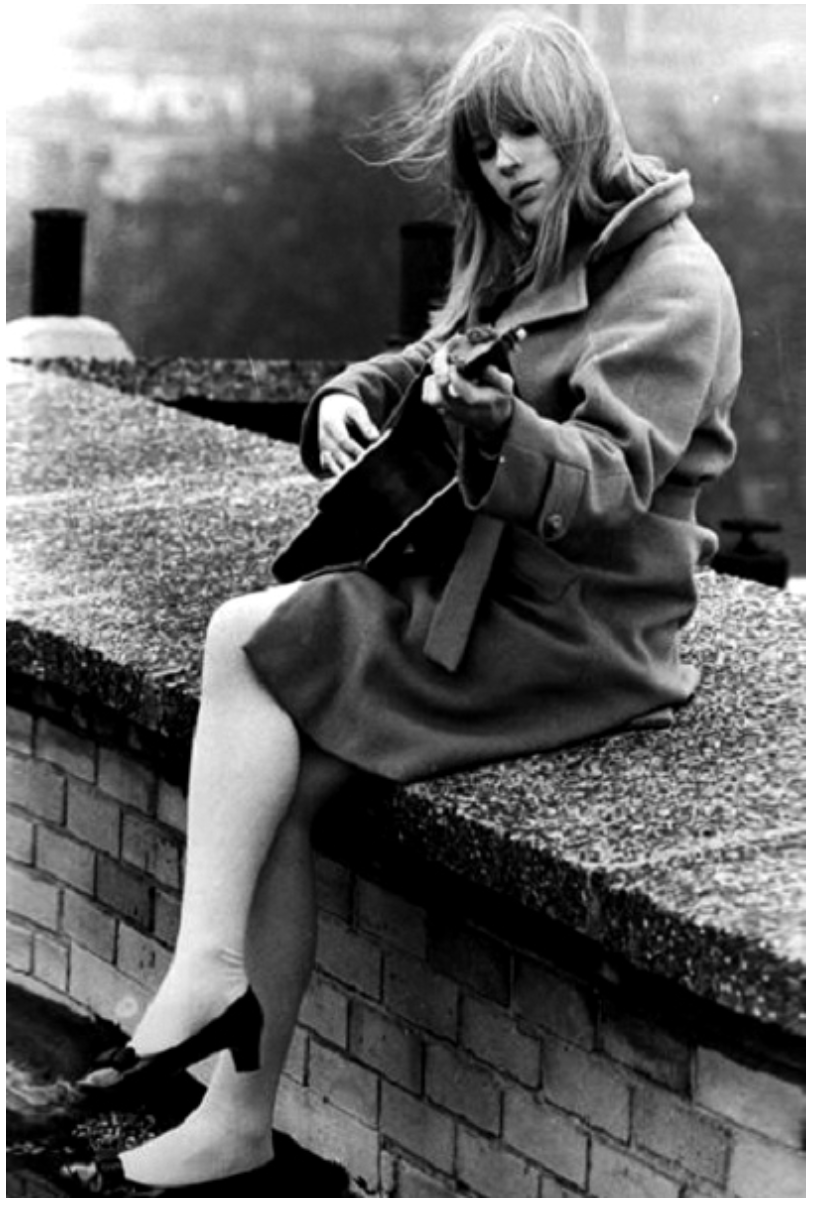 Marianne Faithfull, Mick Jagger’s “Glitter Twin” era girlfriend and artist in her own right, is more a “Mod” than a “Hippie Chick.” Her style is unquestionable, and her work continued to mature from co-authoring her first folk rock hit “As Tears Go By”, through post-addiction driving disco numbers like “Broken English,” to definitive Kurt Weill. She has carries herself with confidence and authority.