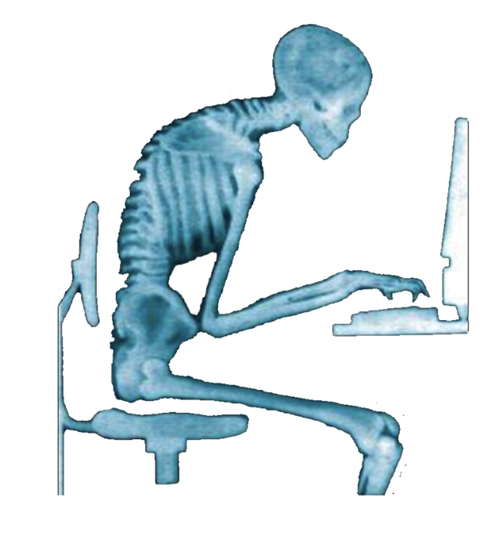 Slumping cuts off your deepest breath. The upper front ribs collapse together while the upper back ribs fan open to create that hump. The shoulder blades splay apart, pressing into the front ribs. The cervical spine, the neck, ends up rounding forward the the head weighted downward. Not pretty, not comfortable.