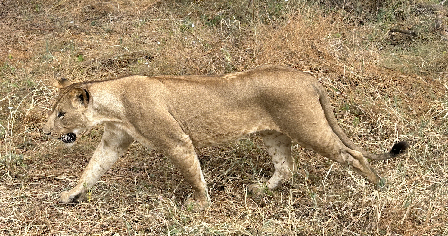 A lioness on the prowl doesn’t waste energy on a tight jaw.