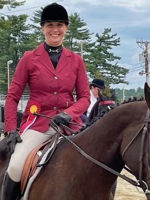 A proud rider displays both her ribbon and elegant clavicle to pelvis alignment.