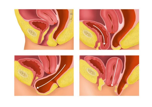 Bottom left: prolapsed colon. Bottom Right: prolapsed uterus